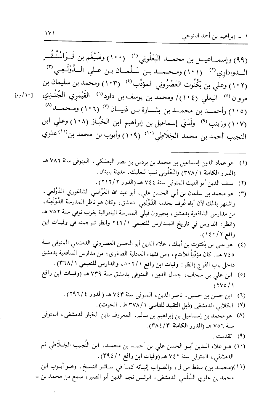 (99) وإسماعيل بن محمد البعلوني (100) وضيغم بن قراسنقر الدوادارى (101) ومحمد بن سلمان بن على الدولعى (102) وعلى بن بكتوت العصرونى المؤدب (103) ومحمد بن سلمان بن مروان البعلى (104) / ومحمد بن يوسف بن داود القيمرى الجندى (105) وأحمد بن محمد بن بشارة بن ذبيان (106) ومحمد (107) وزينب ولدى إسماعيل بن إبراهيم ابن الخباز (108) وعلى ابن النجيب أحمد بن محمد الخلاطى (109) وأيوب بن محمد بن علوي