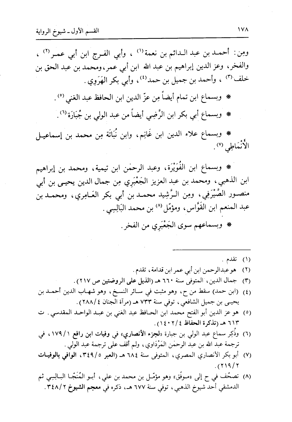 ومن: أحمد بن عبد الدائم بن نعمة، وأبى الفرج ابن أبى عمر، والفخر، وعز الدين إبراهيم بن عبد الله ابن أبى عمر، ومحمد بن عبد الحق بن خلف، وأحمد بن جميل بن حمد، وأبى بكر الهروى.