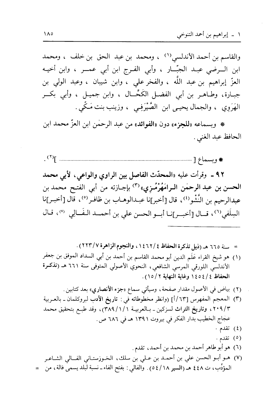 92 - وقرأت عليه "المحدث الفاصل بين الراوى والواعى، لأبى محمد الحسن بن عبد الرحم الرامهرمزى" بإجازته من أبى الفتح محمد بن عبد الرحيم بن النشو، قال [أخبر] نا عبد الوهاب بن ظافر، قال [أخبر] نا السلفي، قال [أخبر] نا أبو الحسن على بن أحمد الفالي، قال