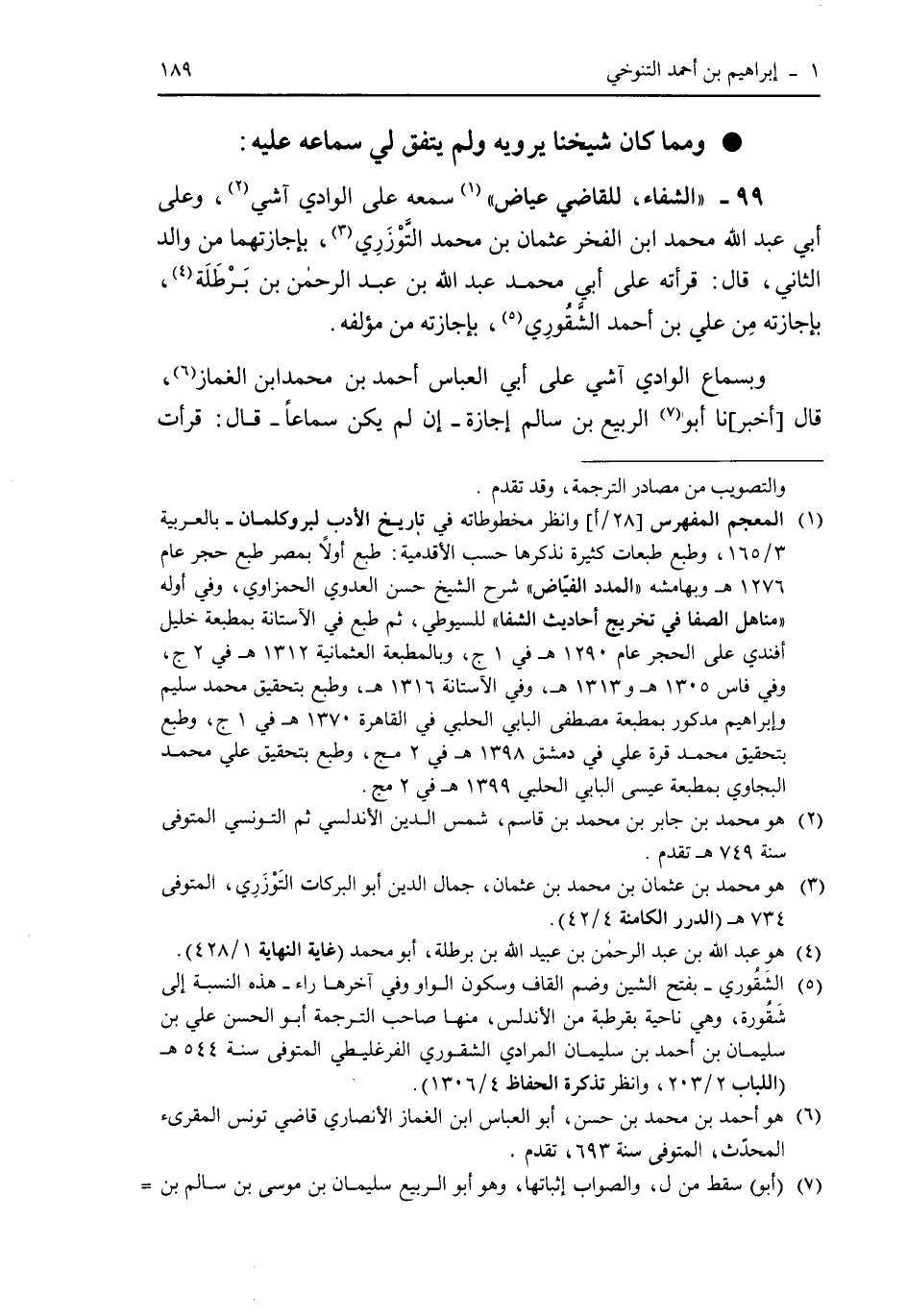 99 - "الشفاء، للقاضى عياض" سمعه على الوادى آشى، وعلى ابى عبد الله محمد ابن الفخر عثمان بن محمد التوزرى، بإجازتهما من والد الثانى، قال: قرأته على ابى محمد عبد الله بن عبد الرحمن بن برطلة، بغجازته من على بن احمد الشقورى، بغجازته من مؤلفه.