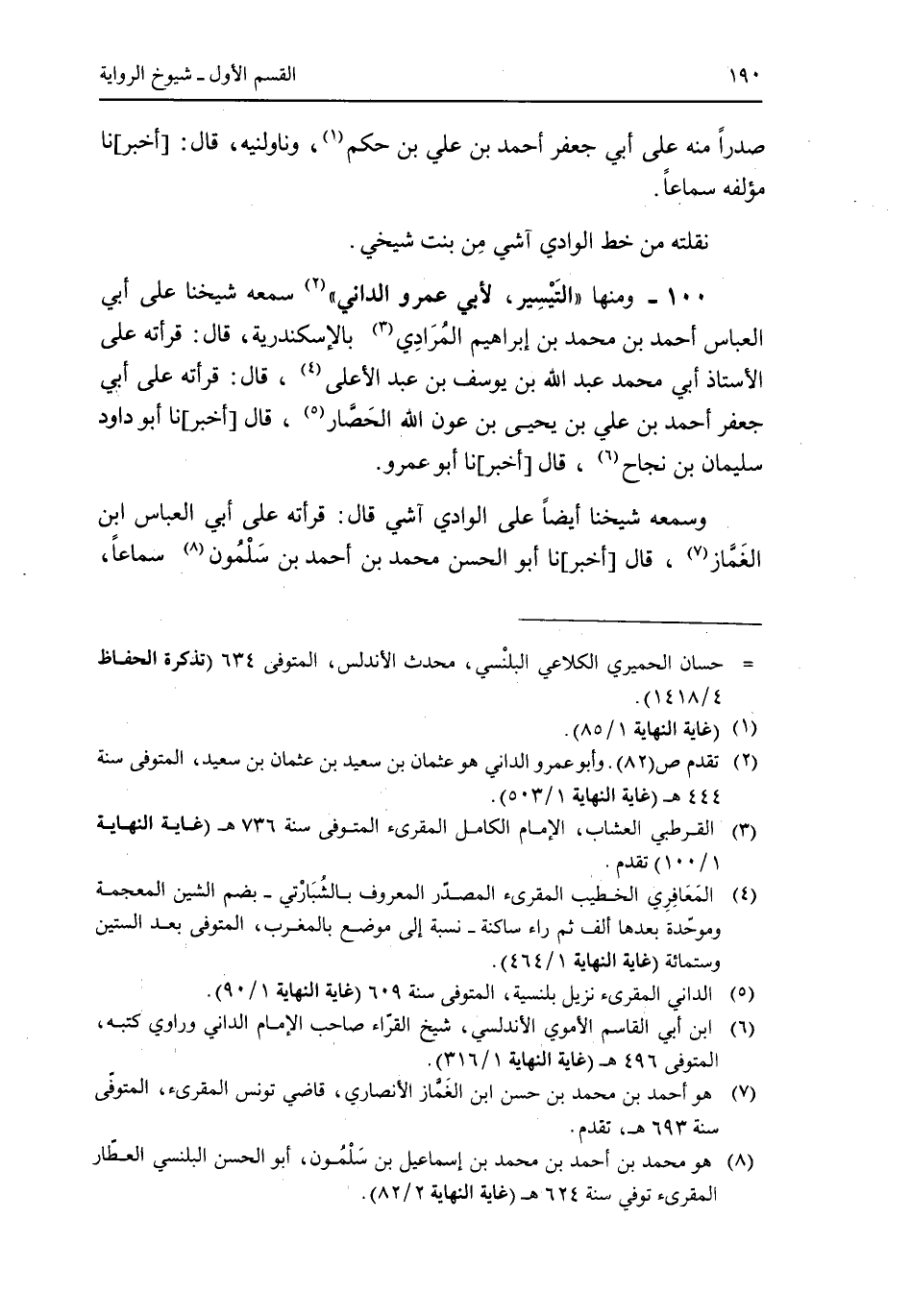 100 - ومنها "التيسير، لأبى عمرو الدانى" سمعه شيخنا على أبى العباس أحمد بن محمد بن إبراهيم المرادى بالإسكندرية، قال: قراته على الأستاذ أبى محمد عبد الله بن يوسف بن عبد الأعلى، قال: قراته على أبى جعفر أحمد بن على بن يحيى بن عون الله الحصار، قال [أخبر] نا أبو داود سليمان بن نجاح، قال ر أبو عمرو.