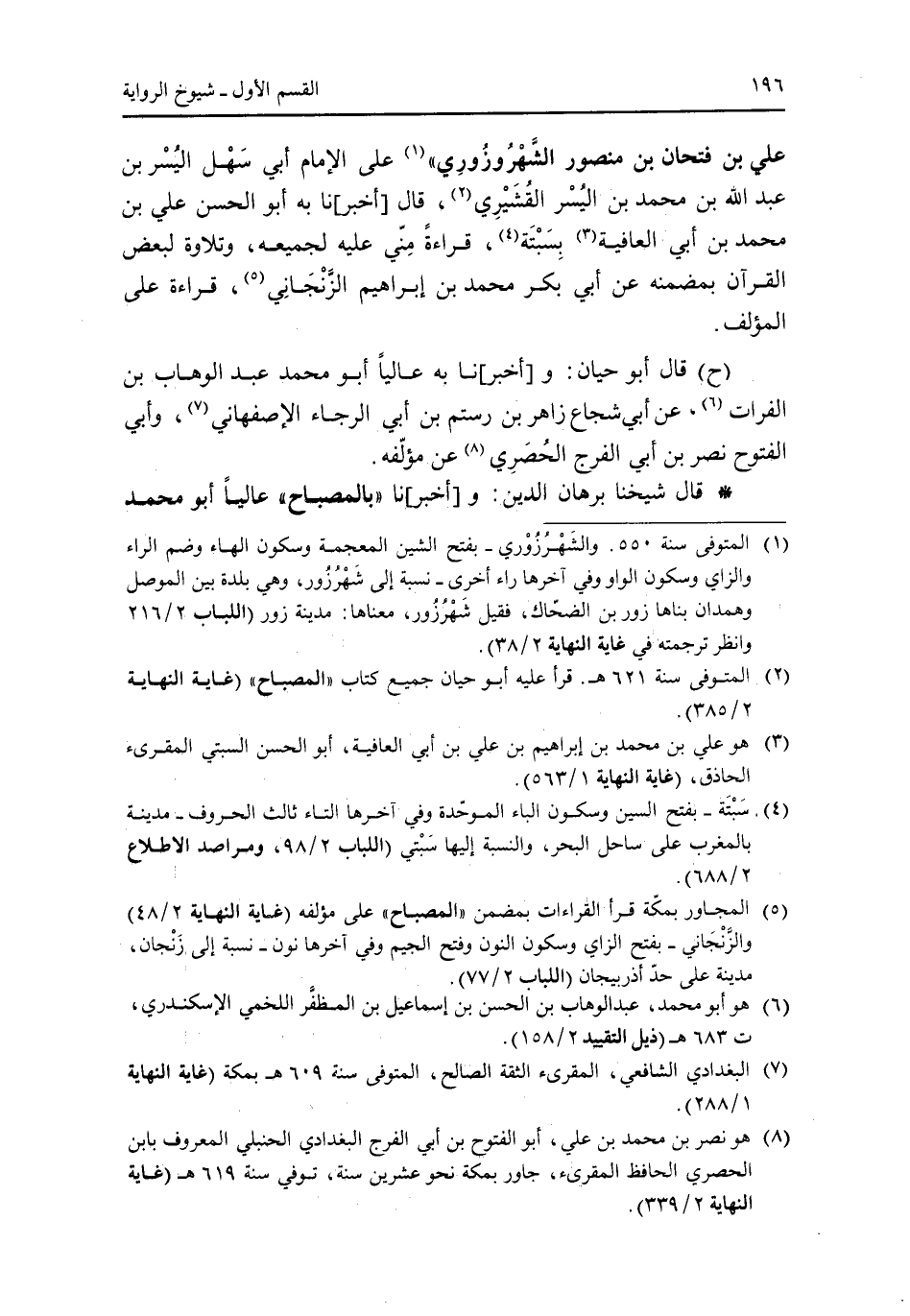 علي بن فتحان بن منصور الشهروزورى" على افمام أبى سهل اليسر بن عبد الله بن محمد بن اليسر القشيرى، قال [أخبر] نا به أبو الحسن على بن محمد بن أبى العافية بسبتة، قراءة منى عليه لجميعه، وتلاوة لبعض القرآن بمضمنه عن أبى بكر محمد بن إبراهيم الزنجانى، قراءة على المؤلف. (ح) قال أبو حيان: و [أخبر] نا به عاليا أبو محمد عبد الوهاب بن الفرات، عن أبى شجاع زاهر بن رستم بن أبى الرجاء الإصفهانى، وأبى الفتوح نصر بن أبى الفرج الحصرى عن مؤلفه.