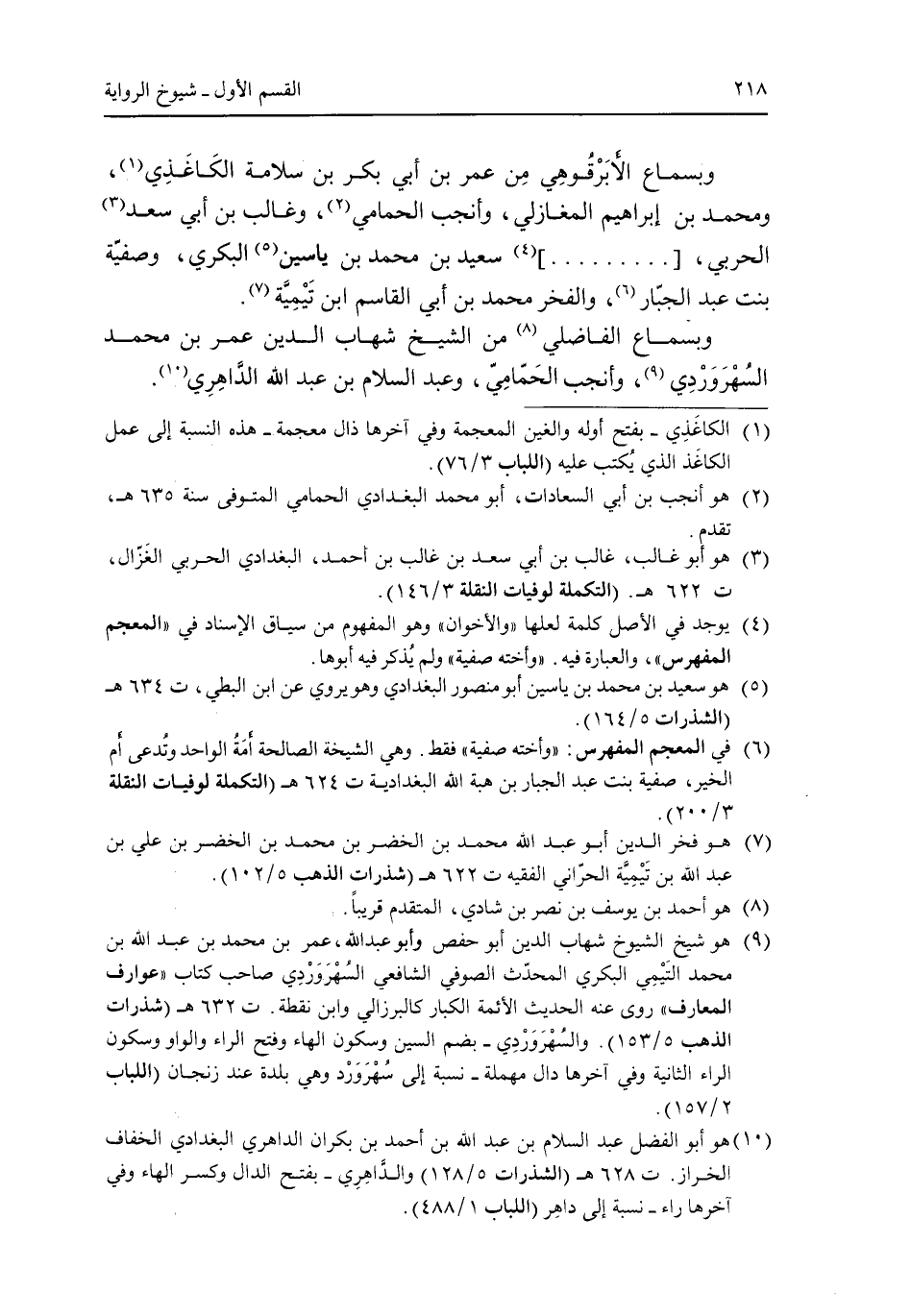 وبسماع الفاضلى من الشيخ شهاب الدين عمر بن محمد السروردى، وأنجب الحمامى، وعبد السلام بن عبد الله الداهري.