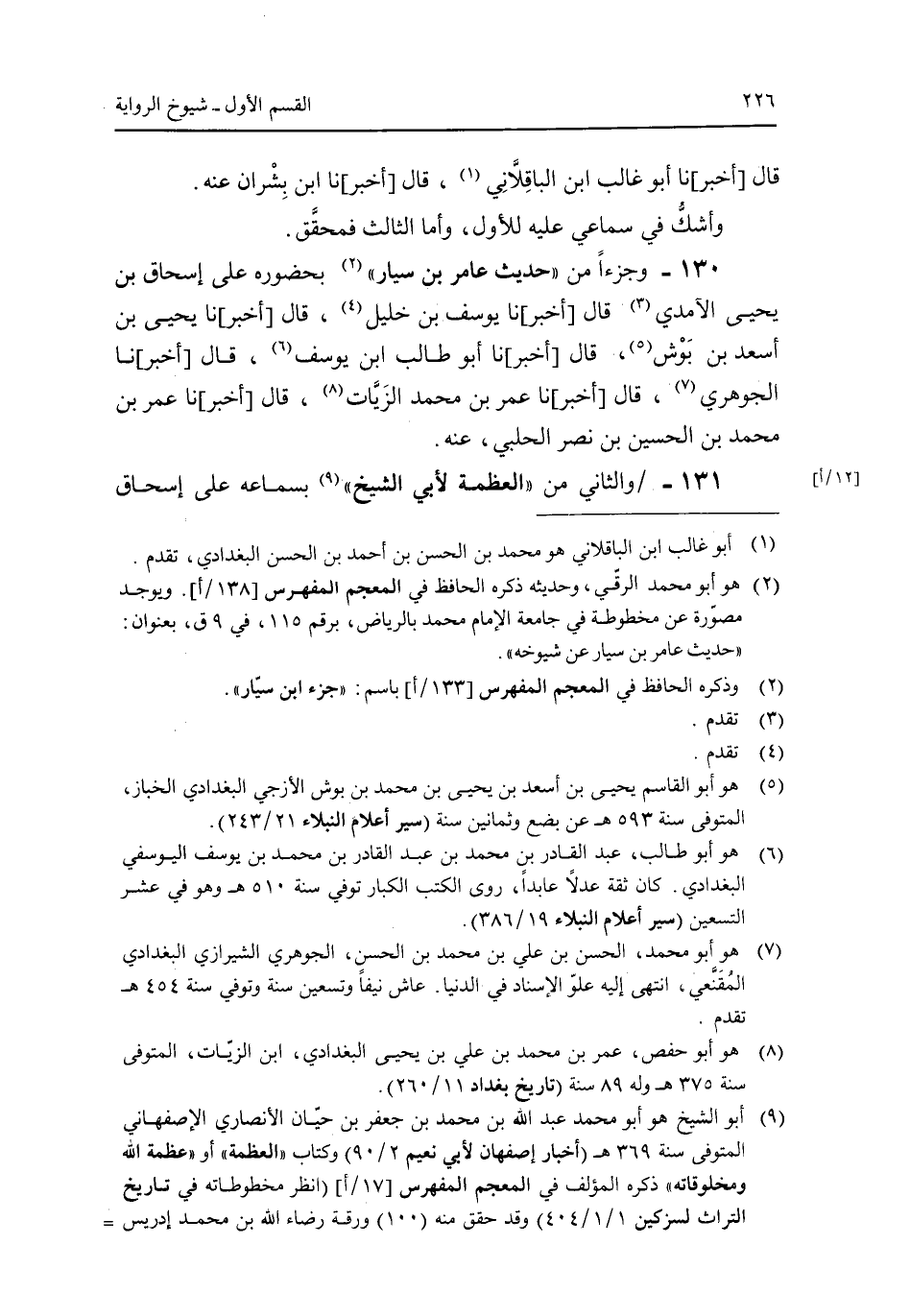 130 - وجزءا من "حديث عامر بن سيار" بحضوره على إسحاق بن يحيى الآمدي قال [أخبر] نا يوسف بن خليل، قال [أخبر] نا يحيى بن أسعد بن بوش، قال [أخبر] نا أبو طالب ابن يوسف، قال [أخبر] نا الجوهري، قال [أخبر] نا عمر بن محمد الزيات، قال [أخبر] نا عمر بن محمد بن الحسين بن نصر الحلبى، عنه.