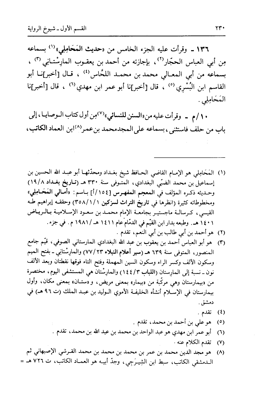 136 - وقرأت عليه الجزء الخامس من "حديث المحاملى" بسماعه من أبى المعالى محمد بن محمد اللحاس، قال [أخبر] نا أبو القاسم ابن البسرى، قال [أخبر] نا أبو عمر ابن مهدى، قال [أخبر] نا المحاملى.
