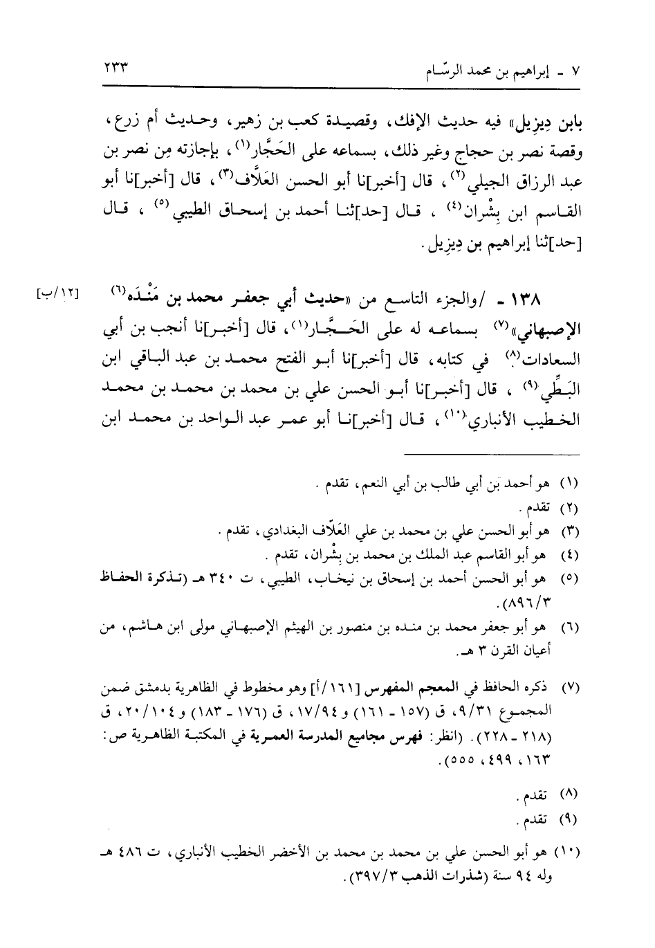 138 - /والجزء التاسع من "حديث أبى جعفر محمد بن منده الإصبهانى" بسماعه له على الحجار، قال [أخبر] نا أنجب بن أبى السعادات. فى كتابه، قال [أخبر] نا أبو الفتح محمد بن عبد الباقى ابن البطى، قال [أخبر] نا أبو الحسن على بن محمد بن محمد بن محمد الخطيب الأنبارى، قال [أخبر] نا أبو عمر عبد الواحد بن محمد ابن