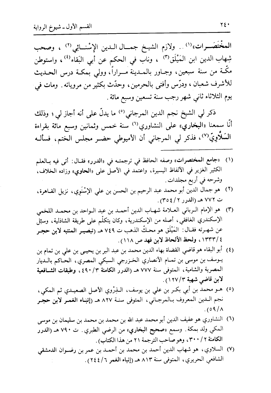 ذكر لى الشيخ نجم الدين المرجانى ما يدل على أنه أجاز لى؛ وذلك أنا سمعنا "البخاري" على النشاورى سنة خمس وثمانين وسبع مائة بقراءة السلاوى، فذكر لى المرجانى أن الأميوطى حضر مجلس الختم، فسأله