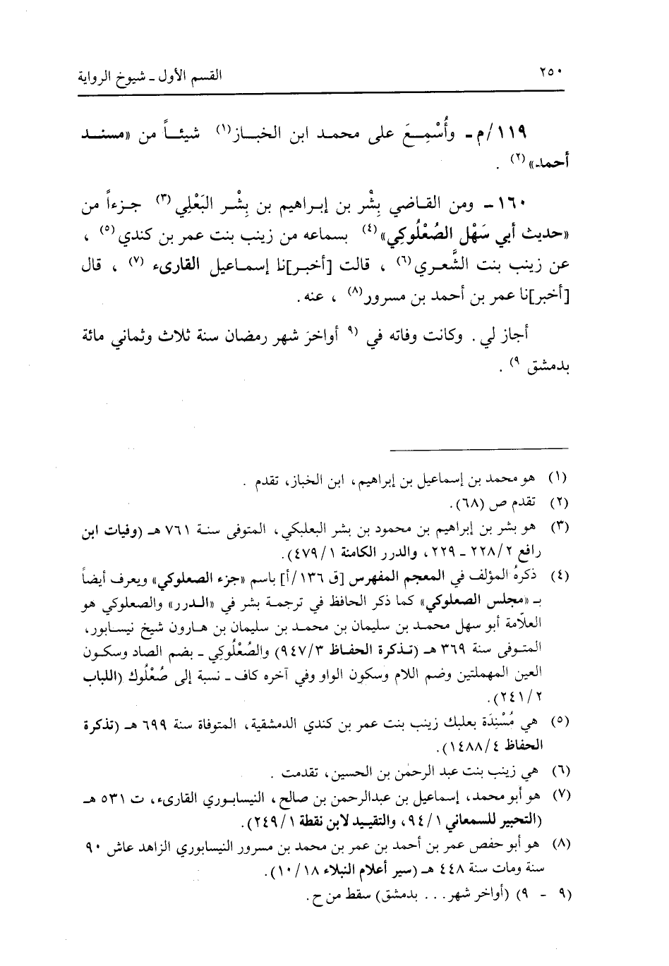 160 - ومن القاضى بشر بن غبراهيم بن بشر البعلى جزءا من "حديث أبى سهل الصعلوكى" بسماعه من زينب بنت عمر بن كندى، عن زينب بنت الشعرى، قالت [أخبر] نا إسماعيل القارئ، قال [أخبر] نا عمر بن أحمد بن مسرور، عنه.