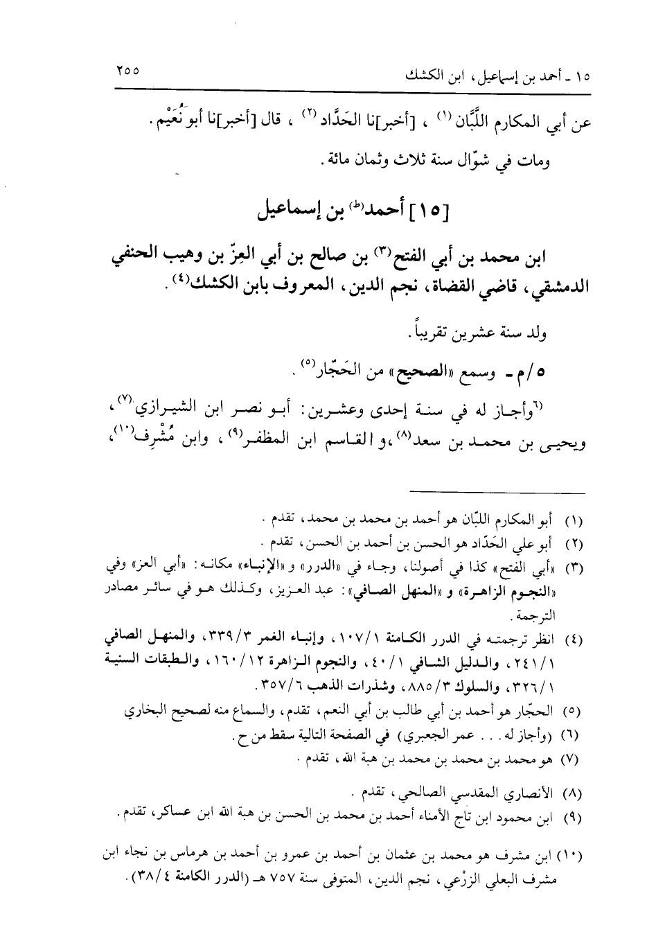 ابن محمد بن أبى الفتح بن صالح بن أبى العز بن وهيب الحنفى الدمشقى، قاضى القضاة، نجم الدين، المعروف بابن الكشكز