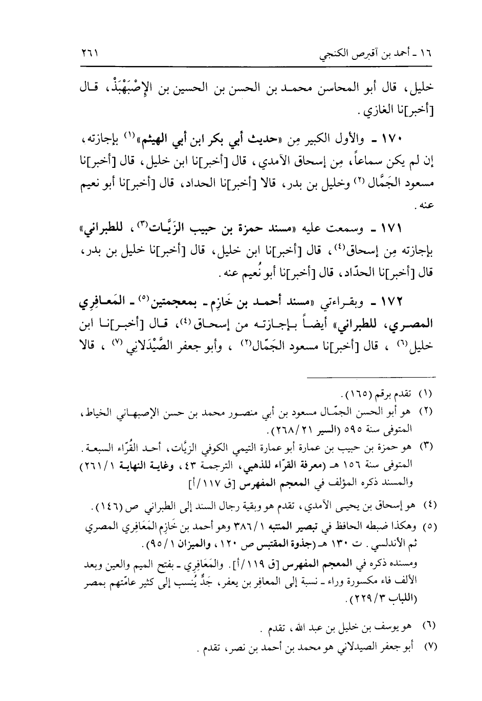 171 - وسمعت عليه "مسند حمزة بن حبيب الزيات، للطبرانى" بإجازتهمن إسحاق، قال [أخبر] نا ابن خليل، قال [أخبر] نا خليل بن بدر، قال [أخبر] نا الحداد، قال [أخبر] نا أبو نعيم.