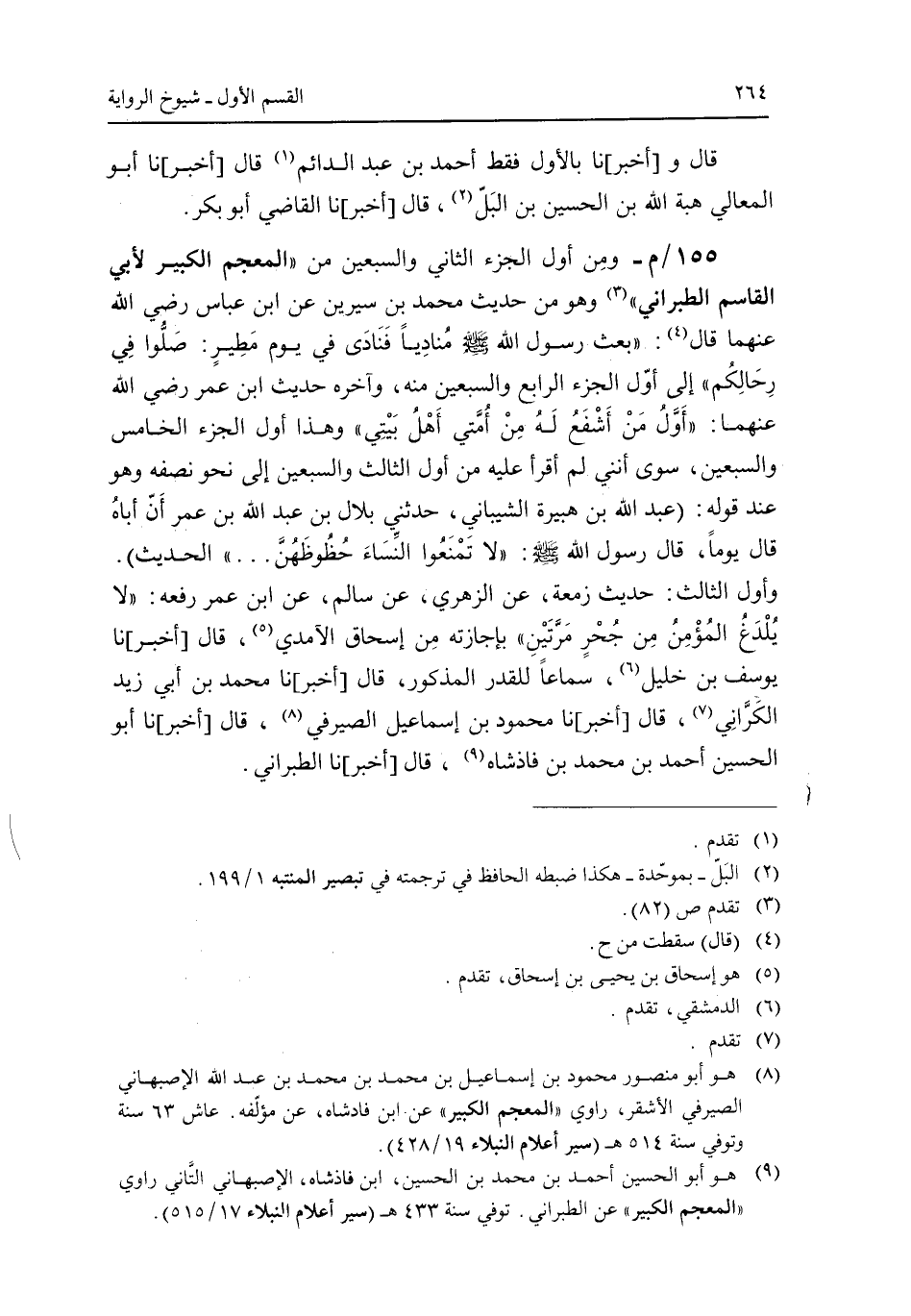155/م - ومن أول الجزء الثانى والسبعين من "المعجم الكبير لأبى القاسم الطبرانى"وهو من حديث محمد بن سيرين عن ابن عباس رضى الله عنهما قال: "بعث رسول الله صلى الله عليه وسلم مناديا فنادى فى يوم مطير: صلوا فى رحالكم" إلى أول الجزء الرابع والسبعين منه، وآخره حديث ابن عمر رضى الله عنهما: "أول من أشفع له من أمتى أهل بيتى" وهذا اول الجزء الخامس والسبعينن سوى اننى لم اقرا عليه من أول الثالث والسبعين غلى نحو نصفه وهو عند قوله: (عبد الله بن هبيرة الشيبانى، حدثنى بلال بن عبد الله بن عمر ان اباه قال يوما، قال رسول الله صلى الله عليه وسلم: "لا تمنعوا النساء حظوظهن ... " الحديث). وأول الثالث: حديث زمعة، عن الزهرى، عن سالم، عن ابن عمر رفعه: "لا يلدغ المؤمن من جحر مرتين" بغجازته من إسحاق الآمدي، قال [أخبر] نا يوسف بن خليل، سماعا للقدر المذكور، قال [أخبر] نا محمد بن أبى زيد الكرانى، قال [أخبر] نا محمود بن إسماعيل الصيرفى، قال [أخبر] نا أبو الحسين أحمد بن محمد بن فاذشاه، قال [أخبر] نا الطبراني.