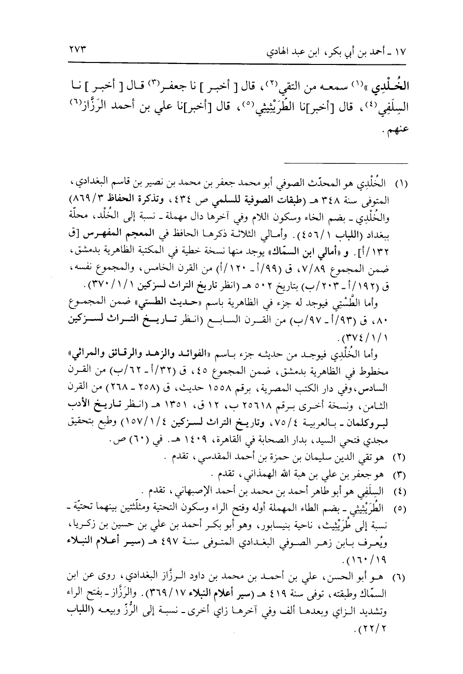 الخلدي" سمعه من التقى، قال [أخبر] نا جعفر قال [أخبر] نا السلفي، قال [أخبر] نا الطريثيثى، قال ر على بن أحمد الرزاز عنهم.