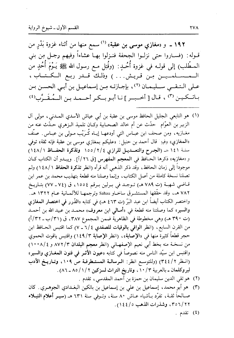192 - و"مغازي موسى بن عقبة" سمع منها من أثناء غزوة بدر من قوله: (فساروا حتى نزلوا الجحفة فنزلوا بها عشاءا وفيهم رجل من بنى المطلب) إلى قوله فى غزوة أحد: (وقتل مع رسول الله صلى الله عليه وسلم يوم أحد من المسلمين من قريش ... ) وذلك قدر ربع الكتاب. على التقى سليمان، بإجازته من إسماعيل بن أبى الحسن بن بانكين، قال [أخبر] نا أبو بكر أحمد بن المقرب