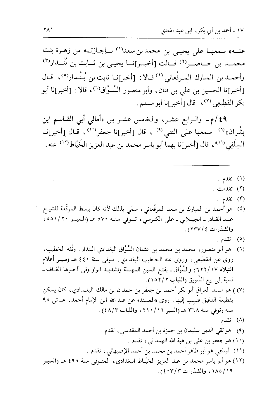 عنه" سمعها على يحيى بن محمد بن سعد بغجازته من زهرة بنت محمد بن حاضر قالت [أخبر] نا يحيى بن ثابت بن بندار وأحمد بن المبارك المرقعاتى قالا: [أخبر] نا ثابت بن بندار، قال [أخبر] نا الحسين بن على بن قنان، وأبو منصور السواق، قالا: [أخبر] نا أبو بكر القطيعى، قال [أخبر] نا أبو مسلم.