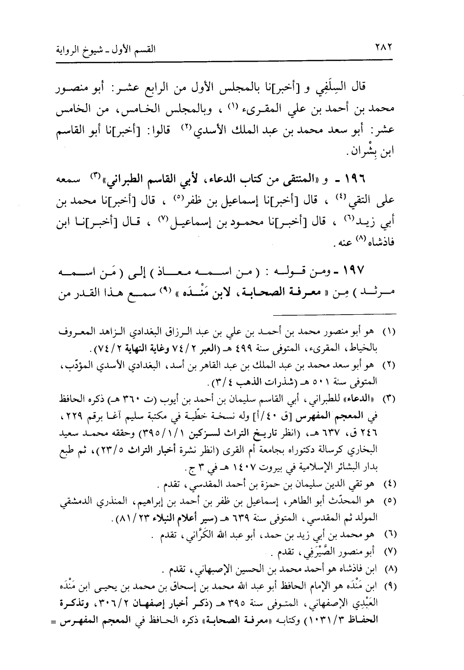 قال السلفي و [أخبر] نا بالمجلس الأول من الرابع عشر: أبو منصور محمد بن أحمد بن على المقرئ، وبالمجلس الخامس، من الخامس عشر: أبو سعد محمد بن عبد الملك الأسدى قالوا: [أخبر] نا أبو القاسم ابن بشران.