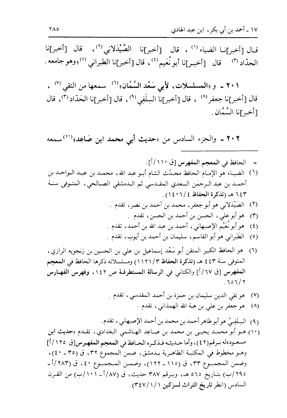 201 - و"المسلسلات، لأبى سعد السمان" سمعها من التقى، قال [أخبر] نا جعفر، قال [أخبر] نا السلفي، قال [أخبر] نا الحداد، قال [أخبر] نا السمان.