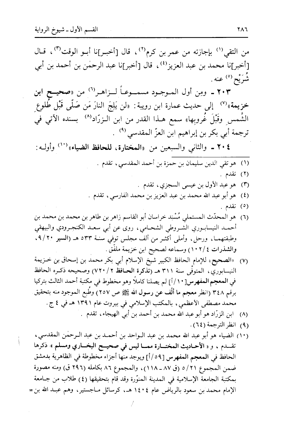 203 - ومن أول الموجود مسموعا لزاهر من "صحيح ابن خزيمة" إلى حديث عمارة ابن رويبة: "لن يلج النار من صلى قبل طلوع الشمس وقبل غروبها" سمع هذا القدر من ابن الزراد بسنده الآتى فى ترجمة أبى بكر بن إبراهيم ابن العز المقدسى.