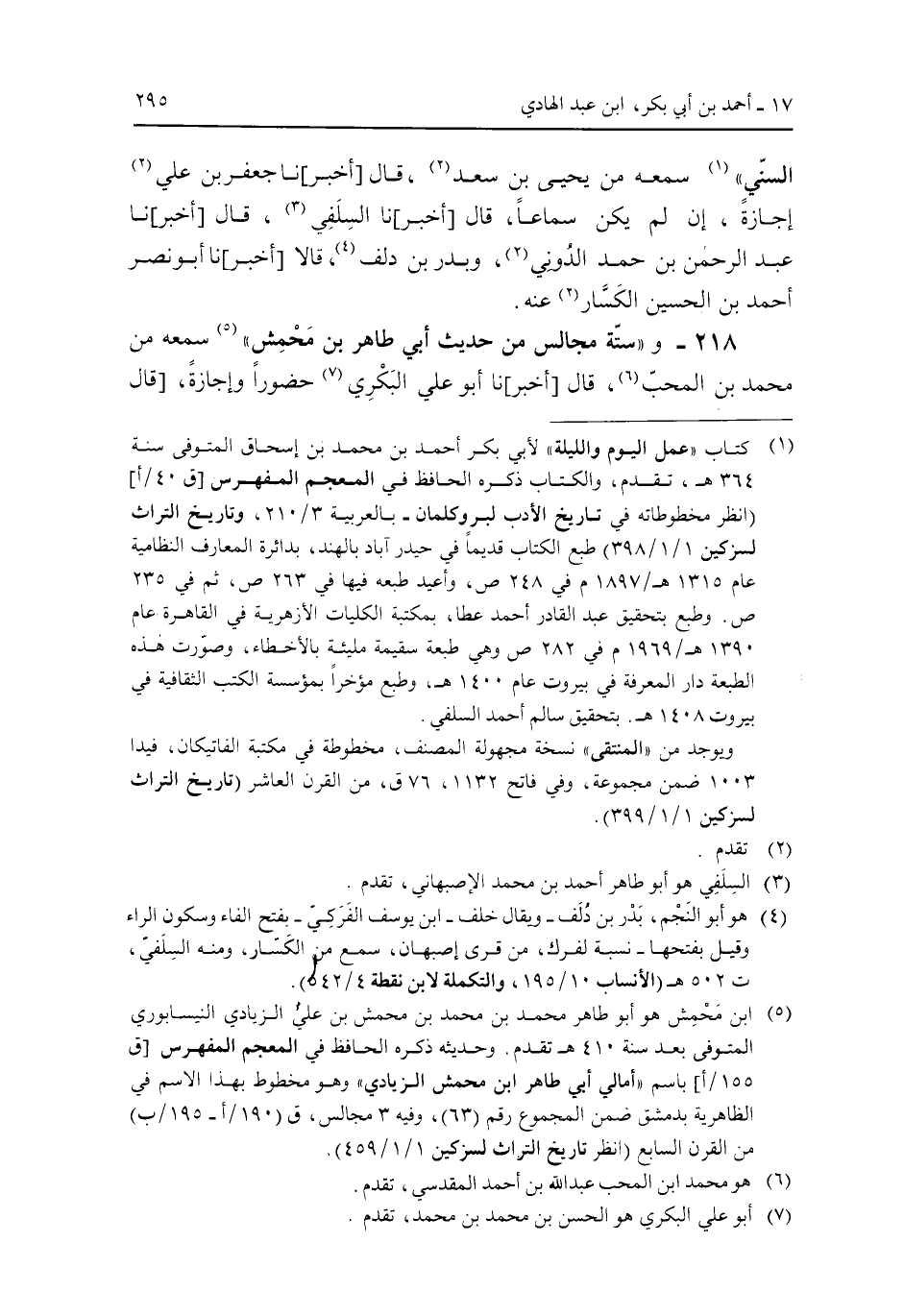 السني" سمعه من يحيى بن سعد، قال [أخبر] نا جعفر بن على إجازة، إن لم يكن سماعا، قال [أخبر] نا السلفي، قال [أخبر] نا عبد الرحمن بن حمد الدونى، وبدر بن دلف، قالا [أخبر] نا أبو نصر أحمد بن الحسين الكسار عنه.