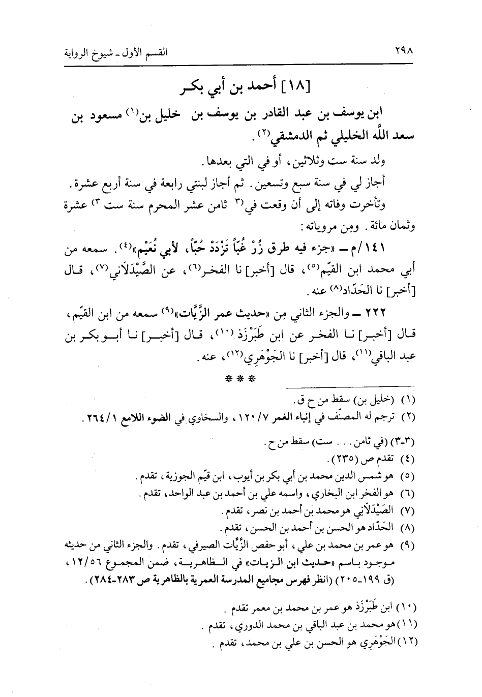 141/م - "جزء فيه طرق زر غبا تزدد حبا، لأبى نعيم". سمعه من أبى محمد ابن القيم، قال [أخبر] نا الفخر، عن الصيدلاني، قال [أخبر] نا الحداد عنه.
