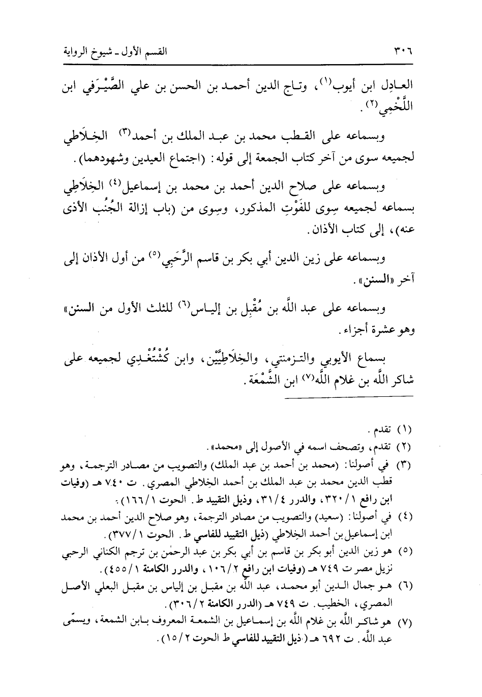 وبسماعه على صلاح الدين أحمد بن محمد بن إسماعيل الخلاطى بسماعه لجميعه سوى للفوت المذكور، وسوى من (باب إزالة الجنب الأذى عنه)، إلى كتاب الأذان.