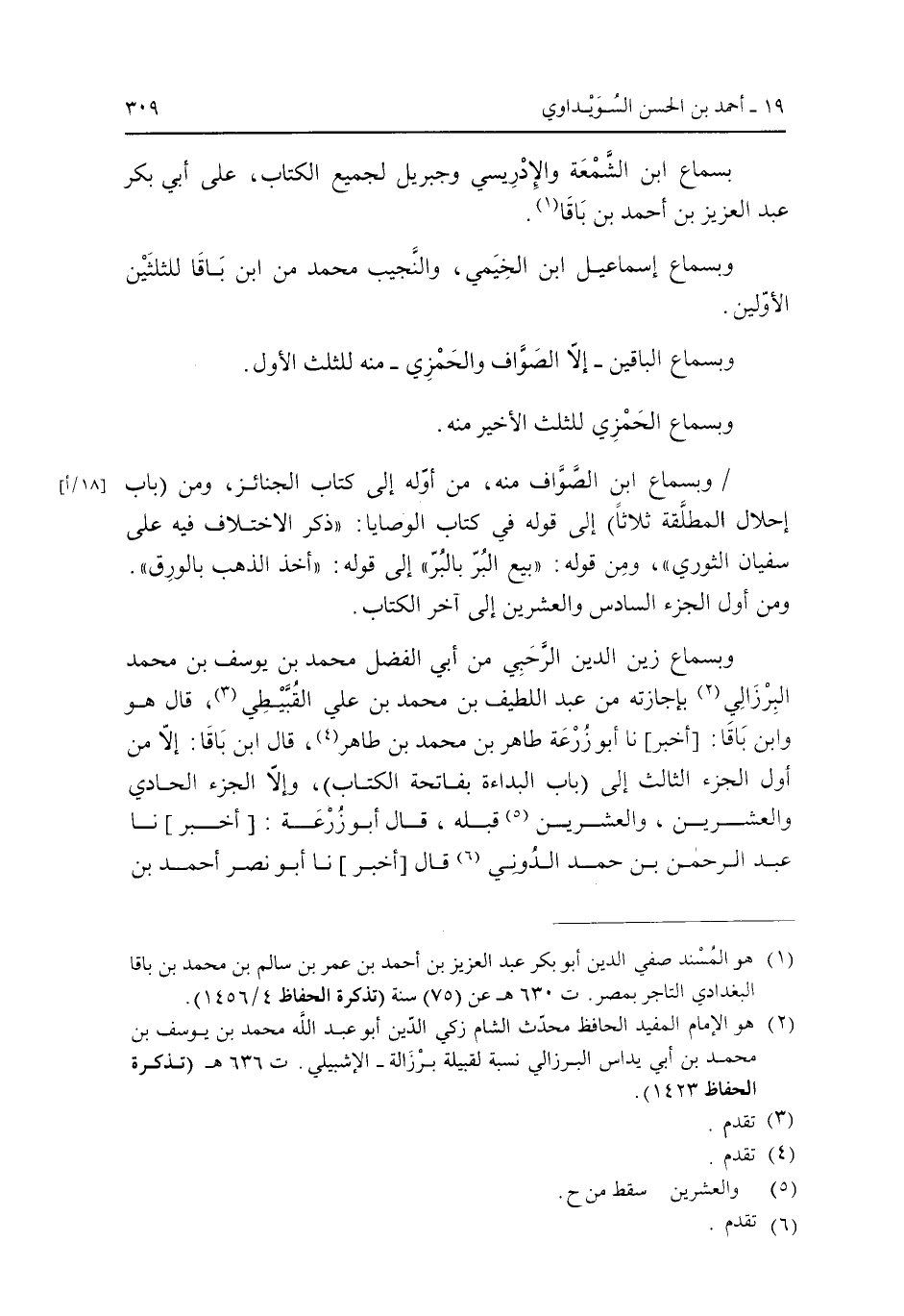 وبسماع زين الدين الرحبى من أبى الفضل محمد بن يوسف بن محمد البرزالي بإجازته من عبد اللطيف بن محمد بن على القبيطى، قال هو وابن باقا: [أخبر] نا أبو زرعة طاهر بن محمد بن طاهر، قال ابن باقا: إلا من أول الجزء الثالث إلى (باب البداءة بفاتحة الكتاب)، وإلا الجزء الحادى والعشرين، والعشرين قبله، قال أبو زرعة: [أخبر] نا عبد الرحمن بن حمد الدونى قال [أخبر] نا أبو نصر أحمد بن