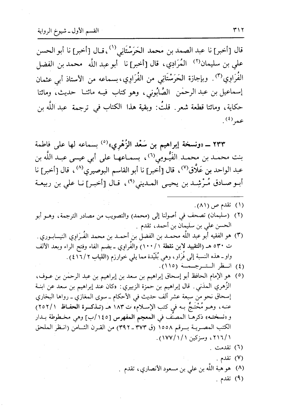 قال [أخبر] نا عبد الصمد بن محمد الحرستاني، قال [أخبر] نا أبو الحسن على بن سليمان المرادى، قال [أخبر] نا أبو عبد الله محمد بن الفضل الفراوى. وبإجازة الحرستاني من الفراوى، بسماعه من الأستاذ أبى عثمان إسماعيل بن عبد الرحمن الصابونى، وهو كتاب فيه مائتا حديث، ومائتا حكاية، ومائتا قطعة شعر. قلت: وبقية الكتاب ترجمة عبد الله بن عمر.