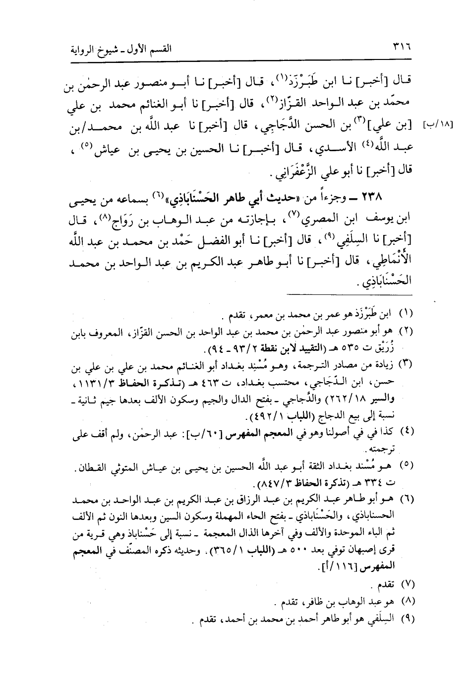 238 - وجزءا من "حديث أبى طاهر الحسناباذى" بسماعه من يحيى ابن يوسف ابن المصرى، بإجازته من عبد الوهاب بن رواج، قال [أخبر] نا السلفي، قال [أخبر] نا أبو الفضل حمد بن عبد الله الأنماطى، قال [أخبر] نا أبو طاهر عبد الكريم بن عبد الواحد بن محمد الحسناباذي.