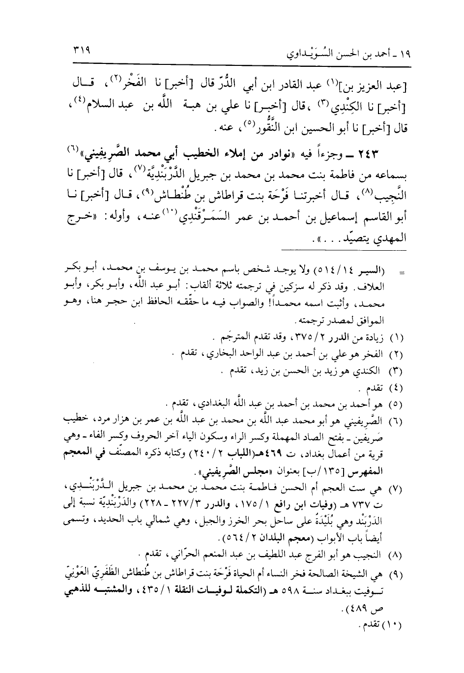 243 - وجزءا فيه "نوادر نمن إملاء الخطيب أبى محمد الصريفينى" بسماعه من فاطمة بنت محمد بن محمد بن جبريل الدربندية، قال [أخبر] نا النجيب، قال أخبرتنا فرحة بنت قراطاش بن طنطاش، قال [أخبر] نا أبو القاسم إسماعيل بن أحمد بن عمر السمرقندى عنه، وأوله: "خرج المهدي يتصيد ... ".