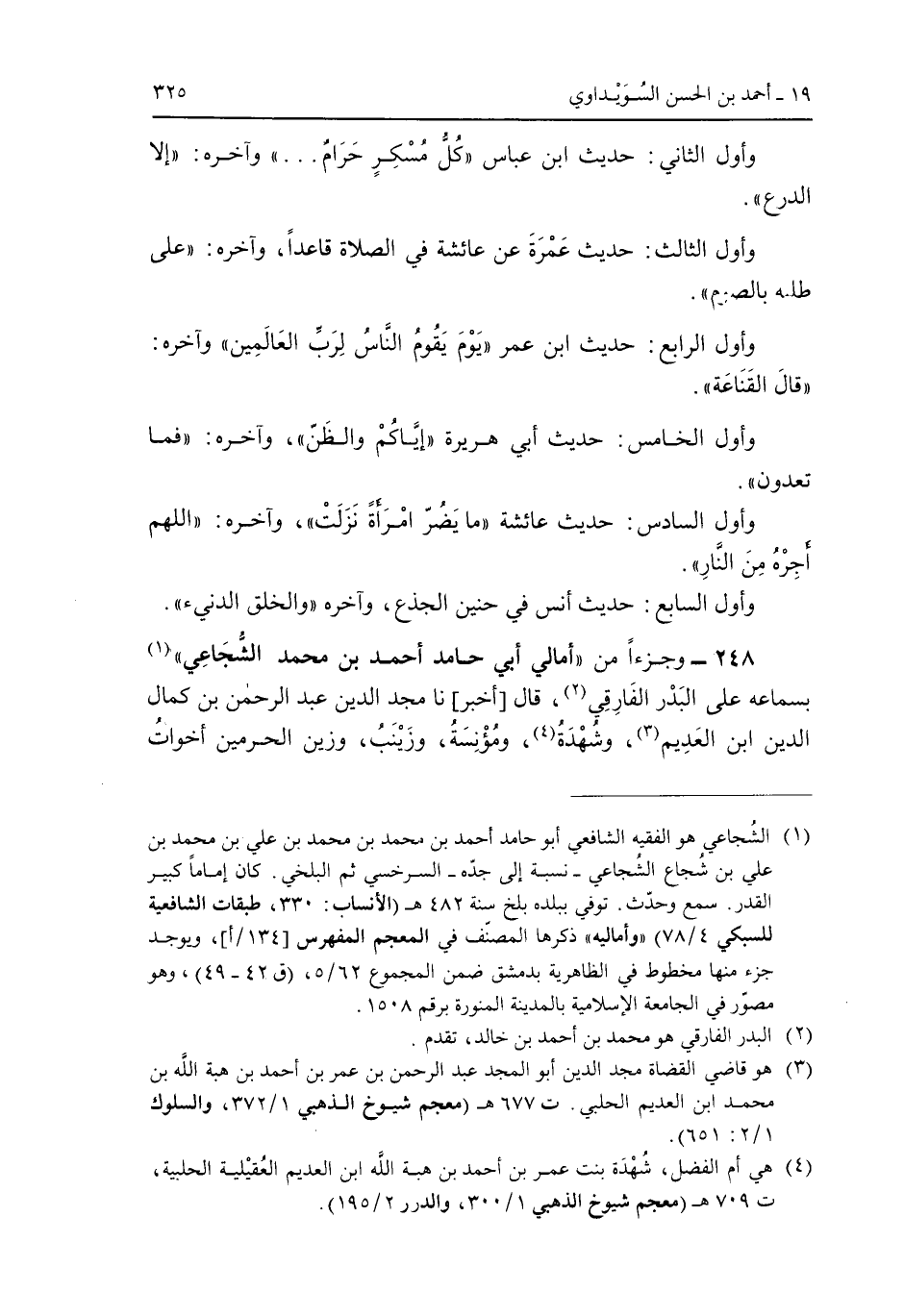 248 - وجزءا من "أمالى أبى حامد أحمد بن محمد الشجاعى"بسماعه على البدر الفارقى، قال [أخبر] نا مجد الدين عبد الرحمن بن كمال الدين ابن العديم، وشهدة، ومؤنسة، وزينب، وزين الحرمين أخوات