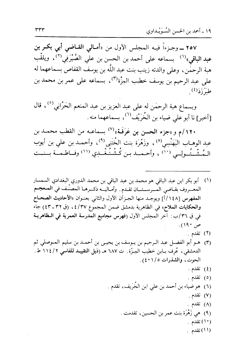 257 - وجزءا فيه المجلس الأول من "أمالى القاضى أبى بكر بن عبد الباقى" بسماعه على أحمد بن الحسن بن على الصيرفى، ويلقب هبة الرحمن، وعلى والدته زينب بنت عبد الله بن يوسف القفاص بساعهما له على عبد الرحيم بن يوسف خطيب المزة، بسماعه على بن محمد بن طبرزد.