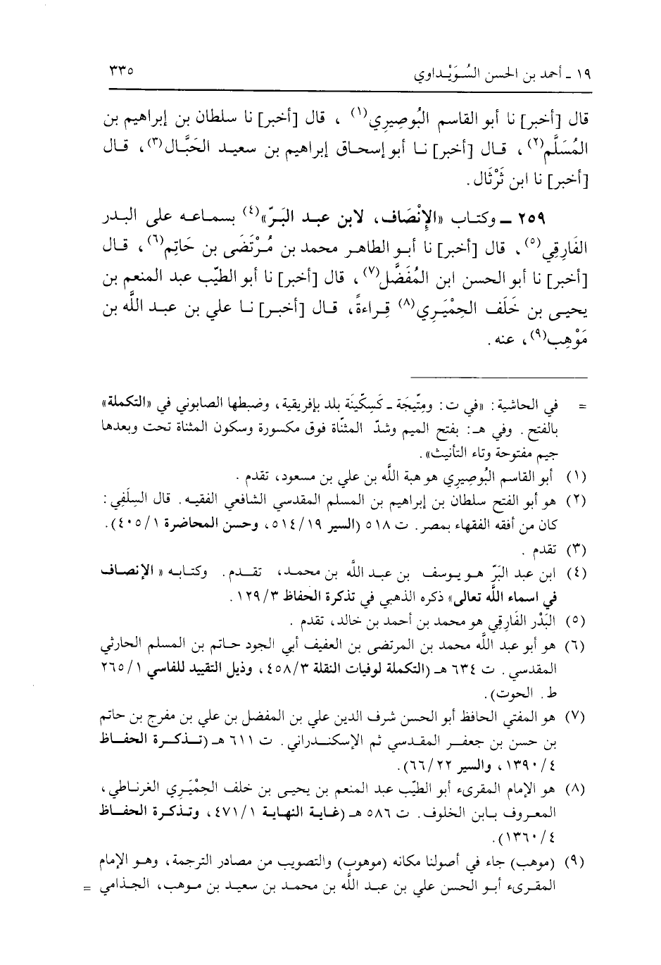259 - وكتاب "الإنصاف، لابن عبد البر" بسماعه على البدر الفارقى، قال [أخبر] نا أبو الطاهر محمد بن مرتضى بن حاتم، قال [أخبر] نا أبو الحسن ابن المفضل، قال [أخبر] نا أبو الطيب عبد المنعم بن يحيى بن خلف الحميرى قراءة، قال [أخبر] نا على بن عبد الله بن موهب، عنه.