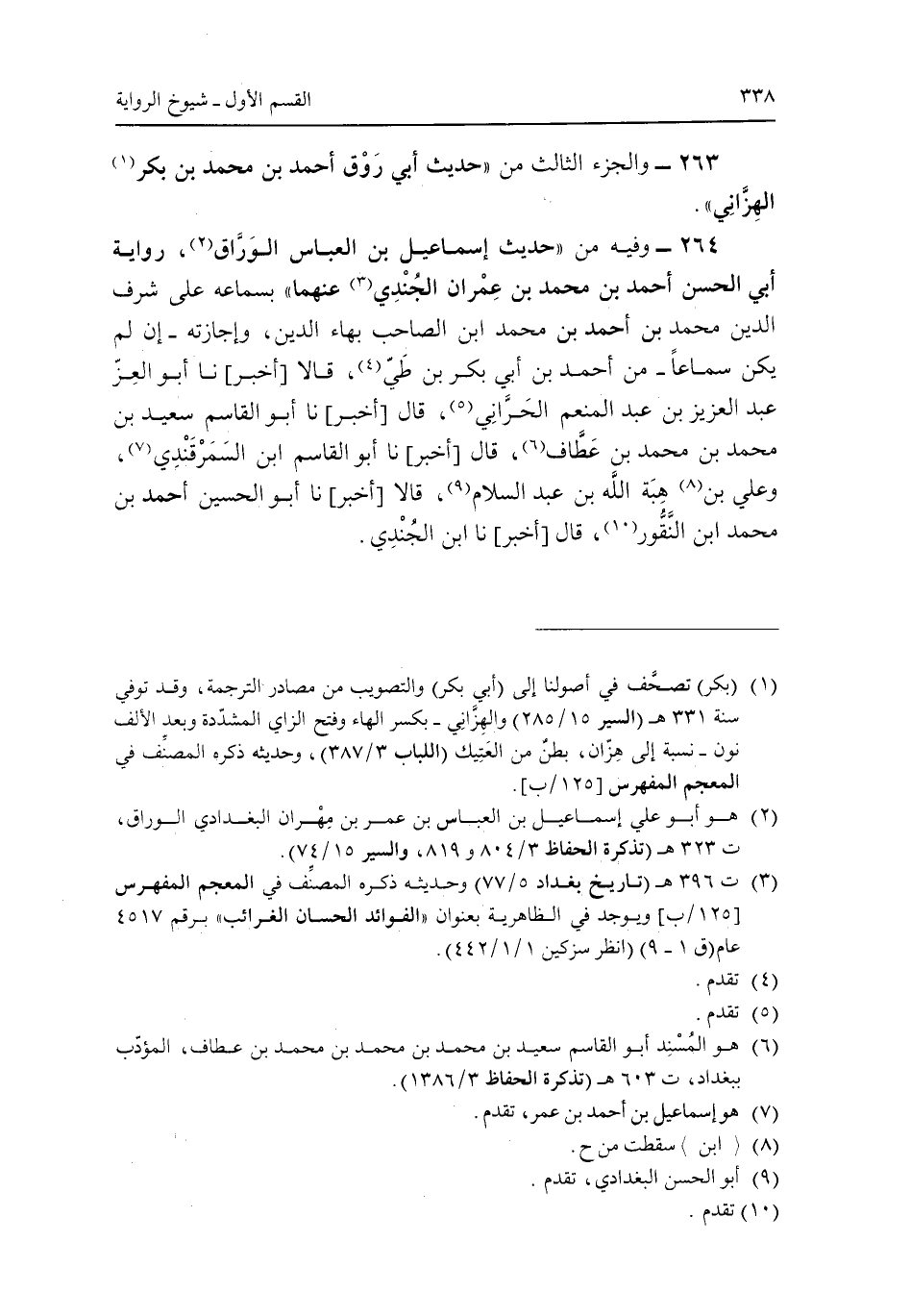 264 - وفيه من "حديث إسماعيل بن العباس الوراق، رواية أبى الحسن أحمد بن عمران الجندى عنهما" بسماعه على شرف الدين محمد بن أحمد بن محمد ابن الصاحب بهاء الدين، وإجازته - إن لم يكن سماعا - من أحمد بن أبى بكر بن طى، قالا [أخبر] نا أبو العز عبد العزيز بن عبد المنعم الحرانى، قال [أخبر] نا أبو القاسم سعيد بن محمد بن محمد بن عطاف، قال [أخبر] نا أبو القاسم ابن السمرقندى، وعلى بن هبة الله بن عبد السلام، قالا [أخبر] نا أبو الحسين أحمد بن محمد ابن النقور، قال [أخبر] نا ابن الجندي.