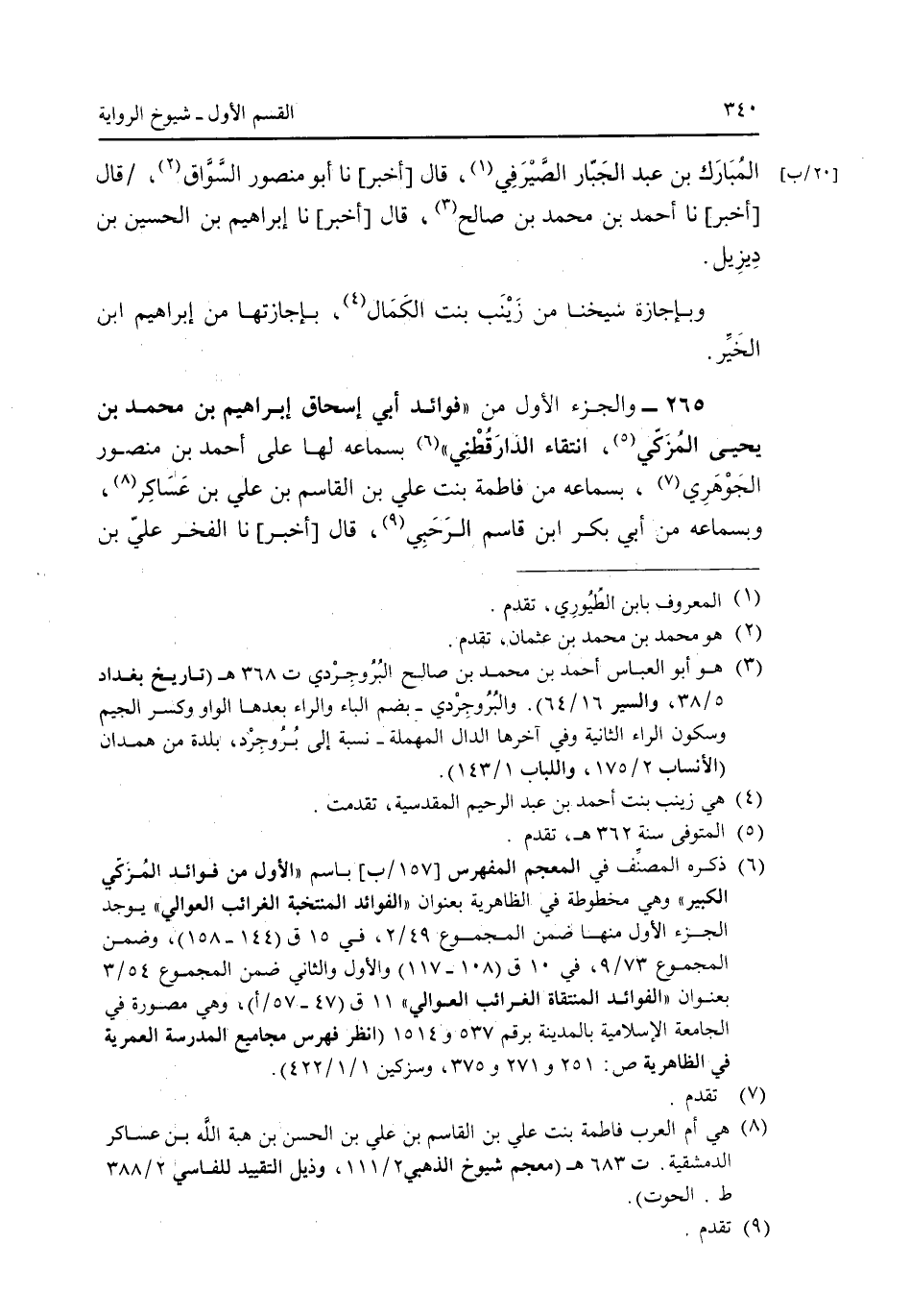 265 - والجزء الأول من "فوائد أبى إسحاق إبراهيم بن محمد بن يحيى المزكىن انتقاء الدارقطني" بسماعه لها على أحمد بن منصور الجوهري، بسماعه من فاطمة بنت على بن القاسم بن على بن عساكر، وبسماعه من أبى بكر ابن قاسم الرحبى، قال [أخبر] نا الفخر علي بن