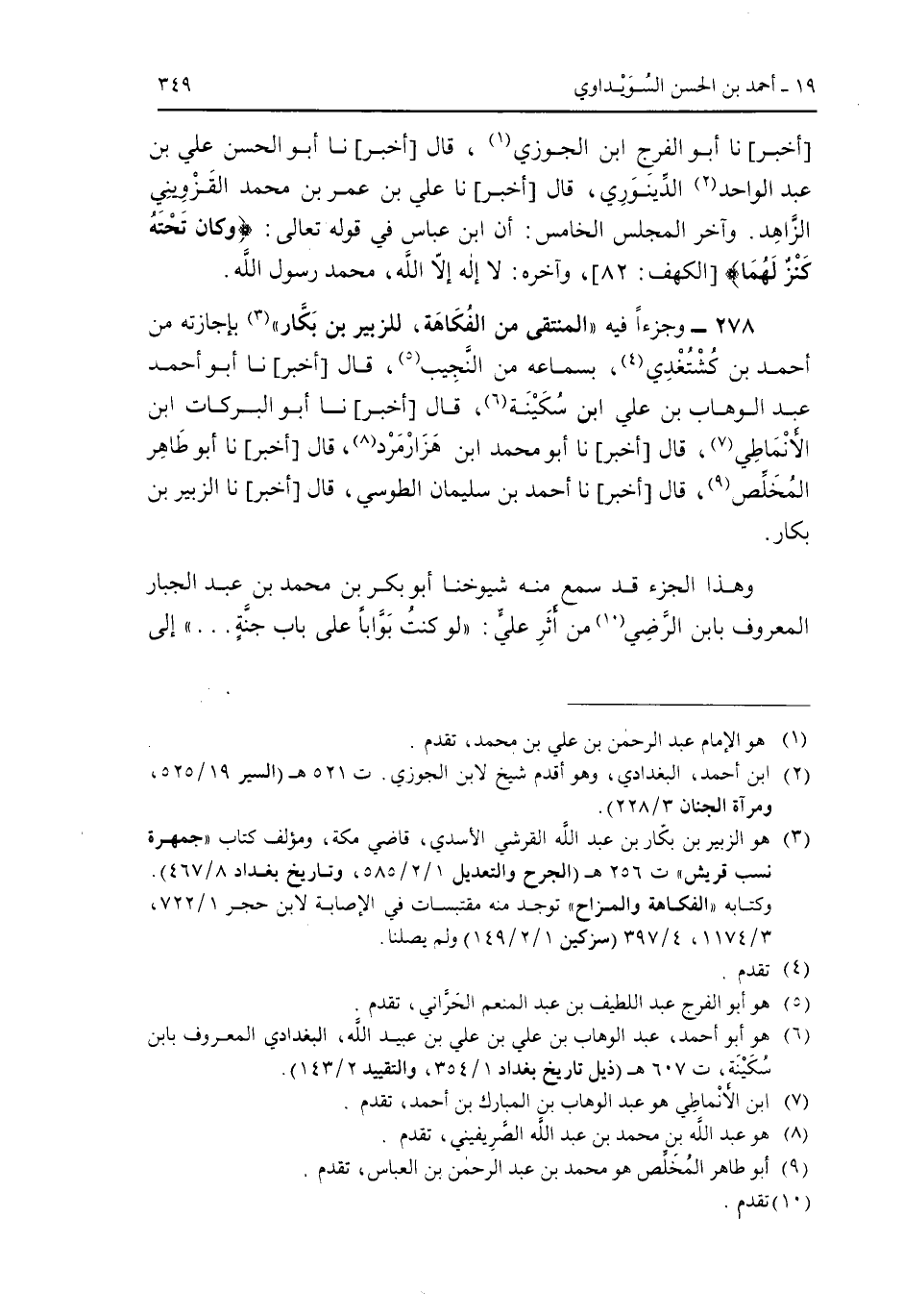 [أخبر] نا أبو الفرج ابن الجوزي، قال [أخبر] نا أبو الحسن على بن عبد الواحد الدينورى، قال [أخبر] نا على بن عمر بن محمد القزويني الزاهد. وآخر المجلس الخامس: أن ابن عباس فى قوله تعالى: (وكان تحته كنز لهما) [الكهف: 82]، وآخره: لا إله إلا الله، محمد رسول الله.