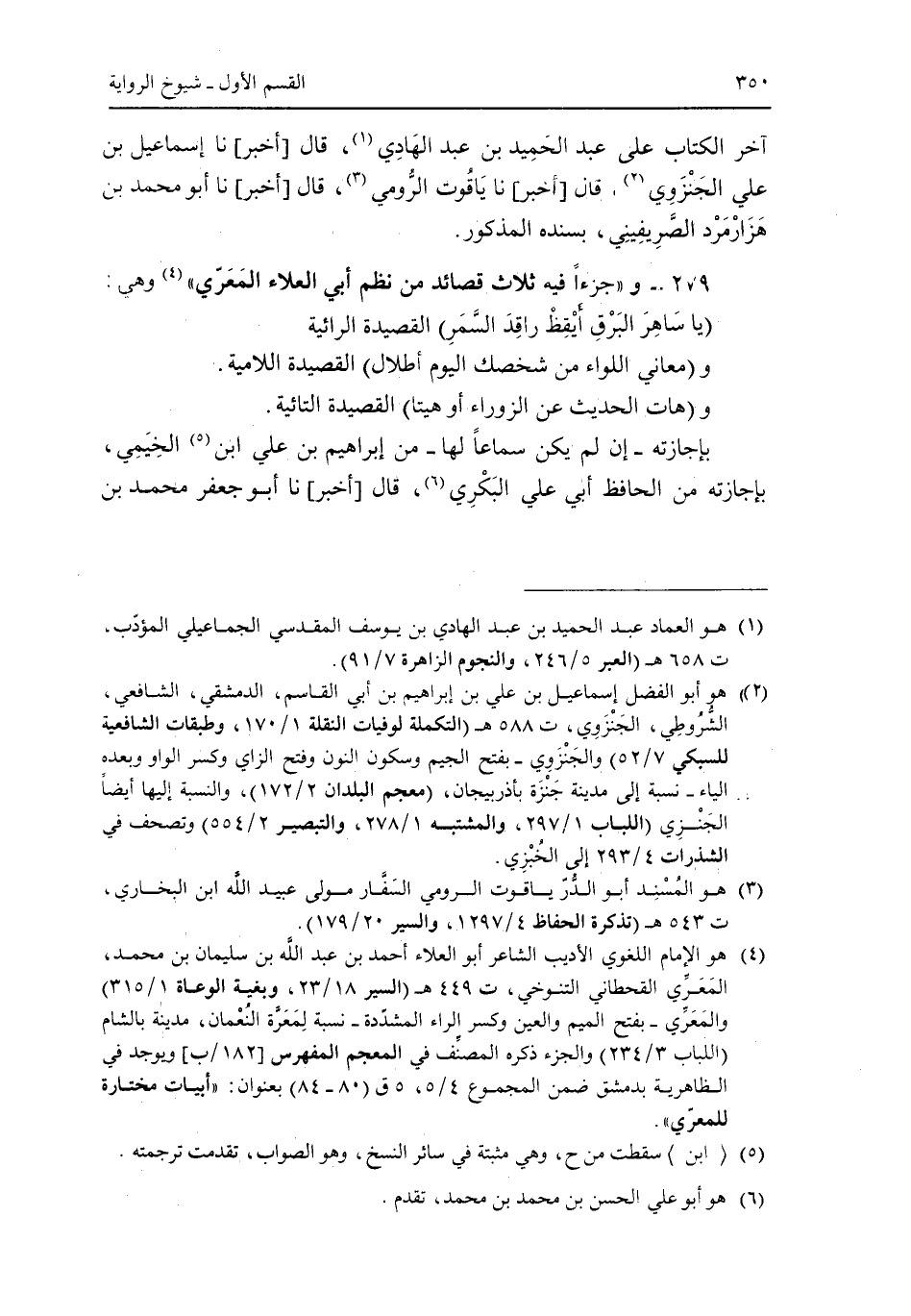 279 - و"جزءا فيه ثلاث قصائد من نظم أبى العلاء المعرى" وهى: (يا ساهر البرق أيقظ راقد السمر) القصيدة الرائية