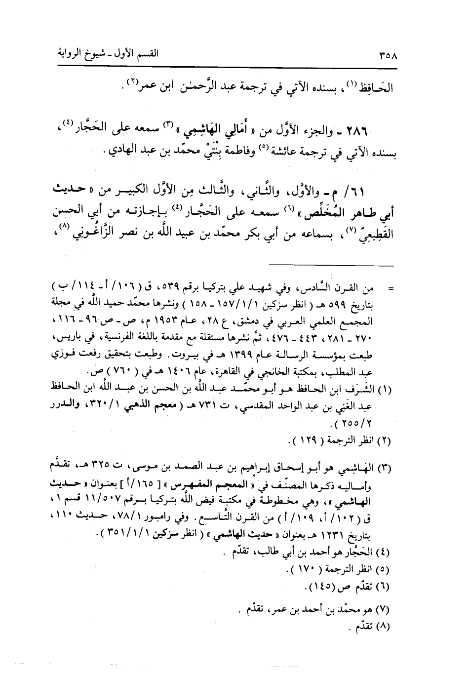 286 - والجزء الأول من "أمالى الهاشمى" سمعه على الحجار، بسنده الآتى فى ترجمة عائشة وفاطمة بنتى محمد بن عبد الهادى.