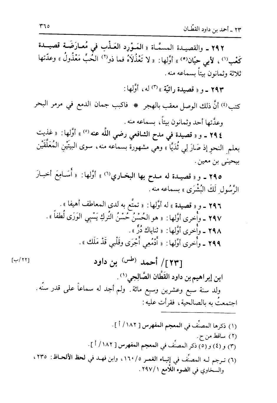 294 - و"قصيدة فى مدح الشافعي رضى الله عنه" أولها: "غذيت بعلم النحو إذ صار لى ثديا" وهى مشهورة بسماعه منه، سوى البيتين المعلقين بيحيى بن معين.