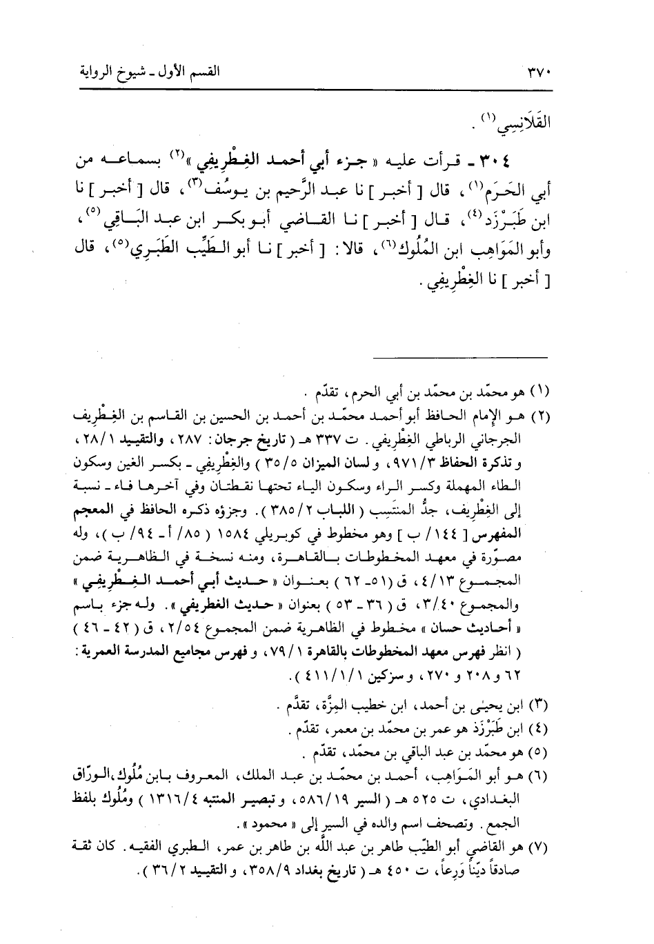 304 - قرأت عليه "جزء أبى أحمد الغطريفى" بسماعه من أبى الحرم، قال [أخبر] نا عبد الرحيم بن يوسف، قال [أخبر] نا ابن طبرزد، قال [أخبر] نا القاضى أبو بكر ابن عبد الباقى، وأبو المواهب ابن الملوك، قالا: [أخبر] نا أبو الطيب الطبرى، قال [أخبر] نا الغطريفي.