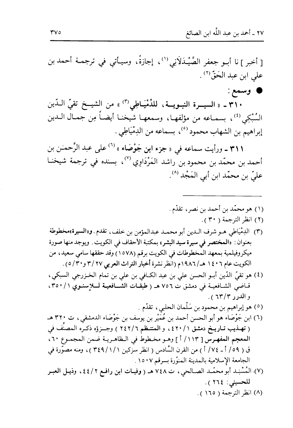 310 - "السيرة النبوية، للدمياطى، من الشيخ تقى الدين السبكى، بسماعه من مؤلفها، وسمعها شيخنا أيضا من جمال الدين إبراهيم بن الشهاب محمود، بسماعه من الدمياطى.