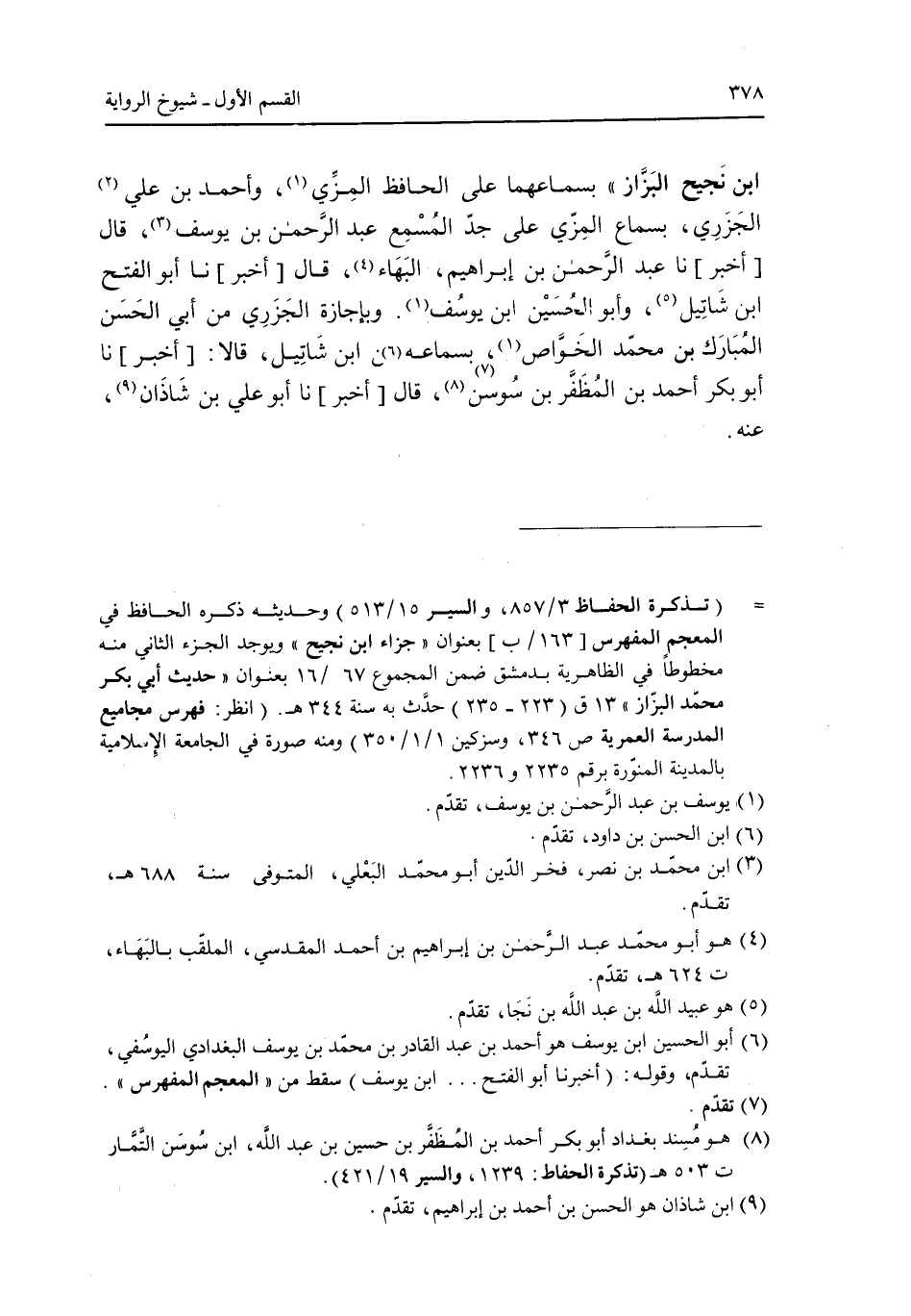 ابن نجيح البزاز" بسماعهما على الحافظ المزى، وأحمد بن على الجزرى، بسماع المزى على جد المسمع عبد الرحمن بن يوسف، قال [أخبر] نا عبد الرحمن بن إبراهيم، البهاء، قال [أخبر] نا أبو الفتح ابن شاتيل، وأبو الحسين ابن يوسف. وبإجازة الجزرى من أبى الحسن المبارك بن محمد الخواص، بسماعه ابن شاتيل، قالا: [أخبر] نا أبو بكر أحمد بن المظفر بن سوسن، قال [أخبر] نا أبو على بن شاذان، عنه.