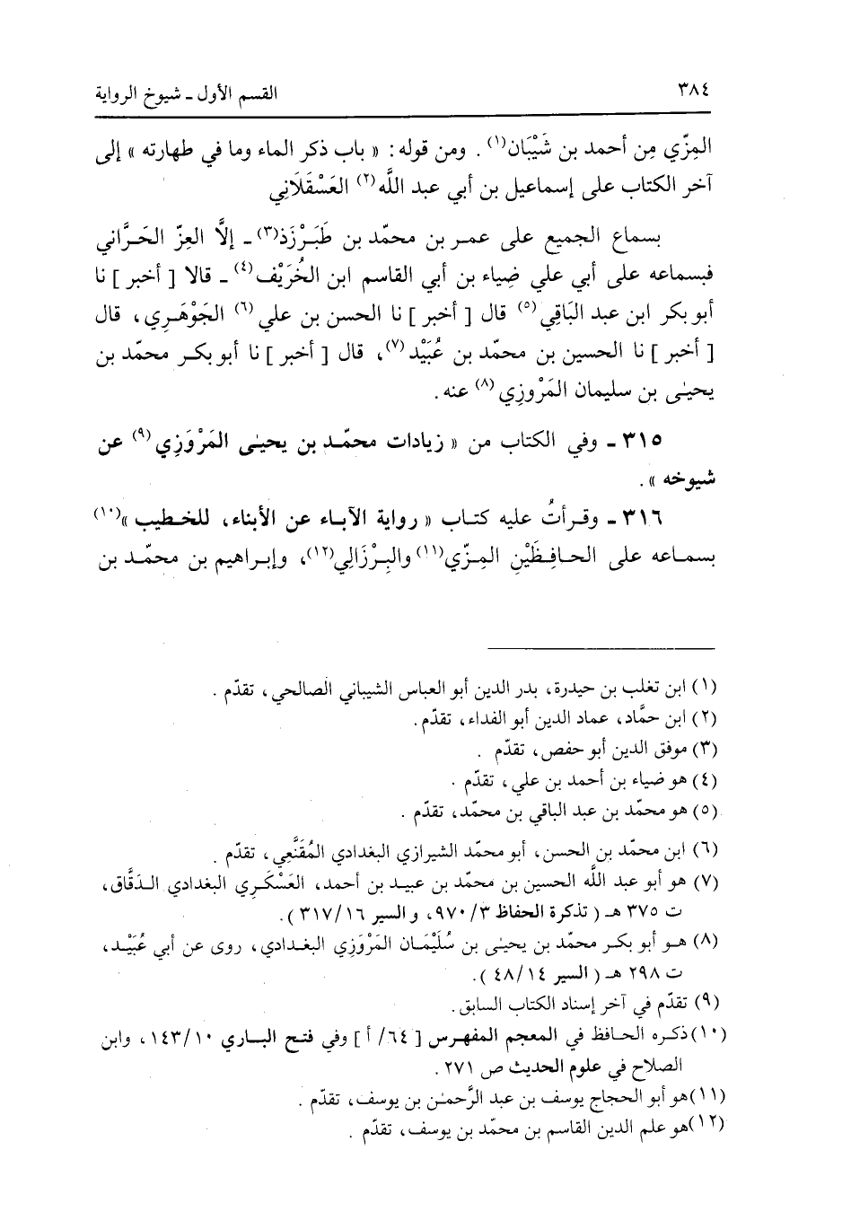 316 - وقرأت عليه كتاب "رواية الآباء عن الأبناء، للخطيب" بسماعه على الحافظين المزى والبرزالي، وإبراهيم بن محمد بن