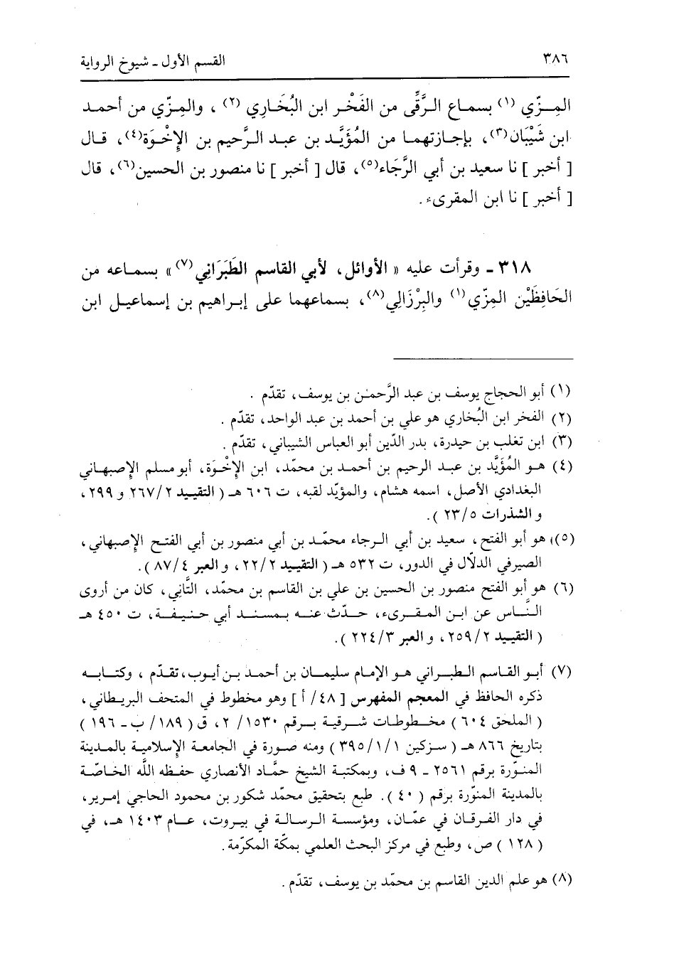 318 - وقرأت عليه "الأوائل، لأبى القاسم الطبرانى" بسماعه من الحافظين المزى والبرزالي، بسماعهما على إبراهيم بن إسماعيل ابن