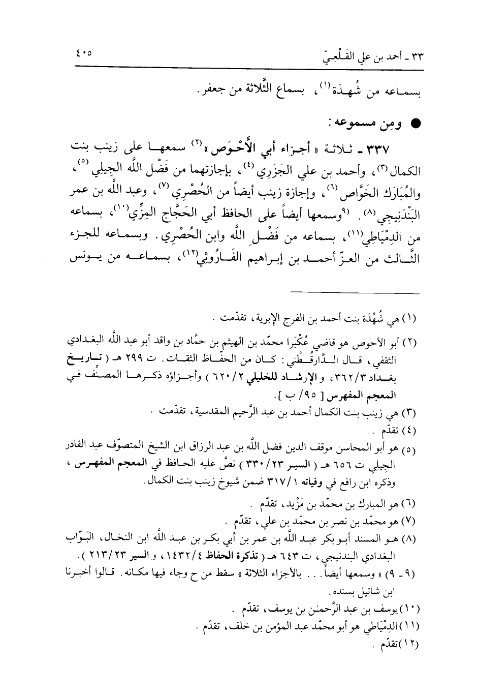337 - ثلاثة "أجزاء أبى الأحوص" سمعها على زينب بنت الكمال، وأحمد بن على الجزرى، بإجازنهما من فضل الله الجيلى، والمبارك الخواص، وإجازة زينب أيضا من الحصرى، وعبد الله بن عمر البندنيجى. وسمعها أيضا على الحافظ أبى الحجاج المزى، بسماعه من الدمياطى، بسماعه من فضل الله وابن الحصرى. وبسماعه للجزء الثالث من العز أحمد بن إبراهيم الفاروثى، بسماعه من يونس