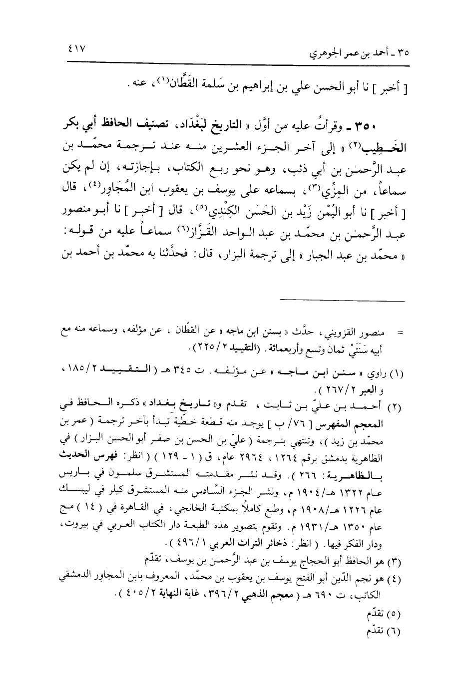 350 - وقرأت عليه من أول "التاريخ لبغداد، تصنيف الحافظ أبى بكر الخطيب" إلى آخر الجزء العشرين منه عند ترجمة محمد بن عبد الرحمن بن أبى ذئب، وهو نحو ربع الكتاب، بإجازته، إن لم يكن سماعا، من المزى، بسماعه على يوسف بن يعقوب ابن المجاور، قال [أخبر] نا أبو اليمن زيد بن محمد بن عبد الواحد القزاز سماعا عليه من قوله: "محمد بن عبد الجبار" إلى ترجمة البزار، قال: فحدثنا به محمد بن أحمد بن