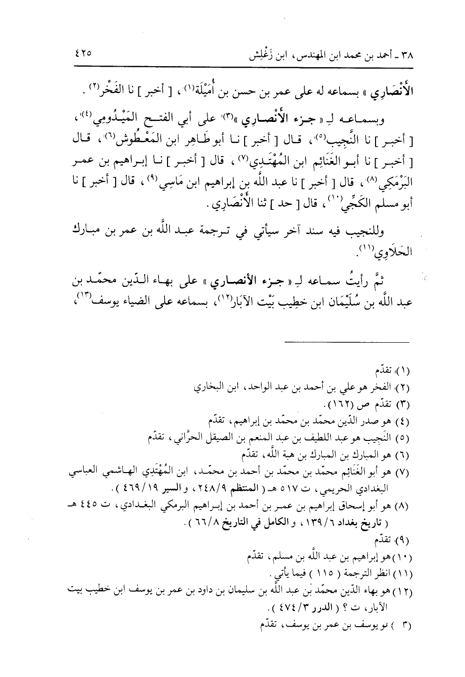 الأنصاري" بسماعه له على عمر بن حسن بن أميلة، [أخبر] نا الفخر, وبسماعه لـ "جزء الأنصارى" على أبى الفتح الميدومي، [أخبر] نا النجيب، قال ر أبو طاهر ابن المعطوش، قال [أخبر] نا أبو الغنائم ابن المهتدى، قال [أخبر] نا إبراهيم بن عمر البرمكى، قال [أخبر] نا عبد الله بن إبراهيم ابن ماسى، قال [أخبر] نا أبو مسلم الكجى، قال [حد] ثنا الأنصارى.