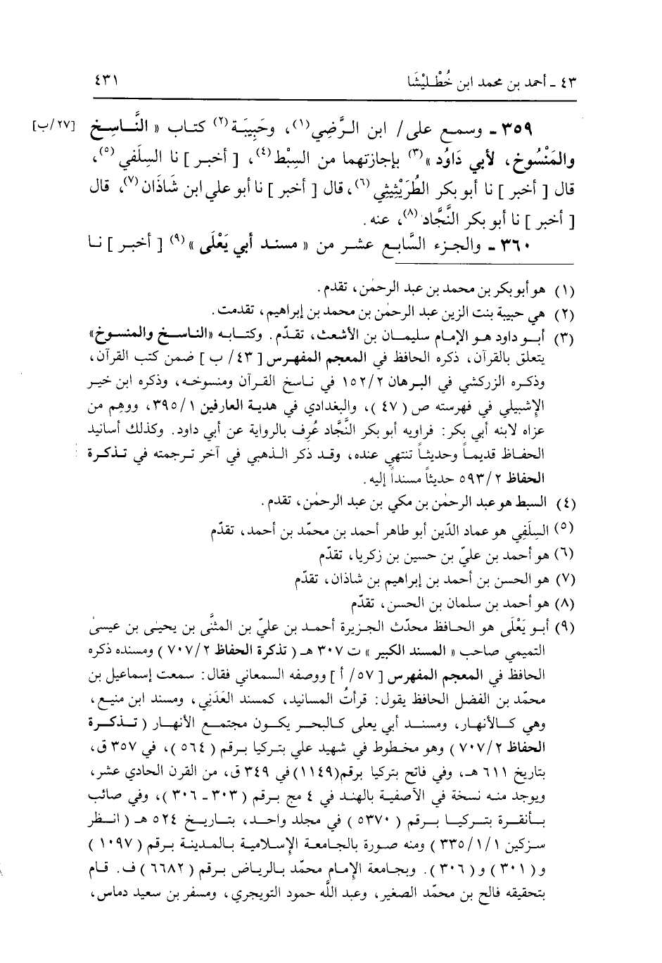 359 - وسمع على/ ابن الرضي، وحبيبة كتاب "الناسخ والمنسوخ، لأبي داود" بإجازتهما من السبط، [أخبر] نا السلفي، قال [أخبر] نا أبو بكر الطريثيثي، قال [أخبر] نا أبو علي ابن شاذان، قال [أخبر] نا أبو بكر النجاد، عنه.