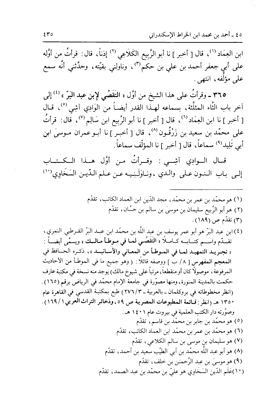 365 - وقرأت على هذا الشيخ من أول "التقصي لإبن عبد البر" إلى آخر باب الثاء المثلثة بسماعه لهذا القدر أيضاً من الوادي آشي قال [أخبر] نا ابن العماد قال [أخبر] نا أبو الربيع بن سالم قال: قرأت على محمد بن سعد بن زرقون قال [أخبر] نا أبو عمران موسى ابن أبي تليد سماعاً قال [أخبر] نا المؤلف سماعاً