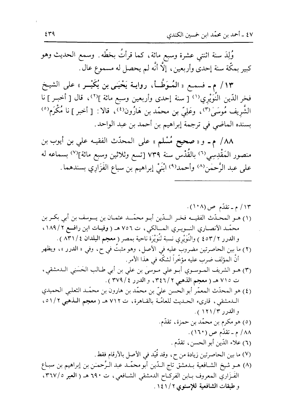 88/م- و "صحيح مسلم" على المحدث الفقيه علي ابن أيوب بن منصور المقدسي بالقدس سنة 739 تسع وثلاثين وسبع مائة بسماعه له على عبد الرحمن وأحمد ابني إبراهيم بن سباع الفزاري بسندهما.