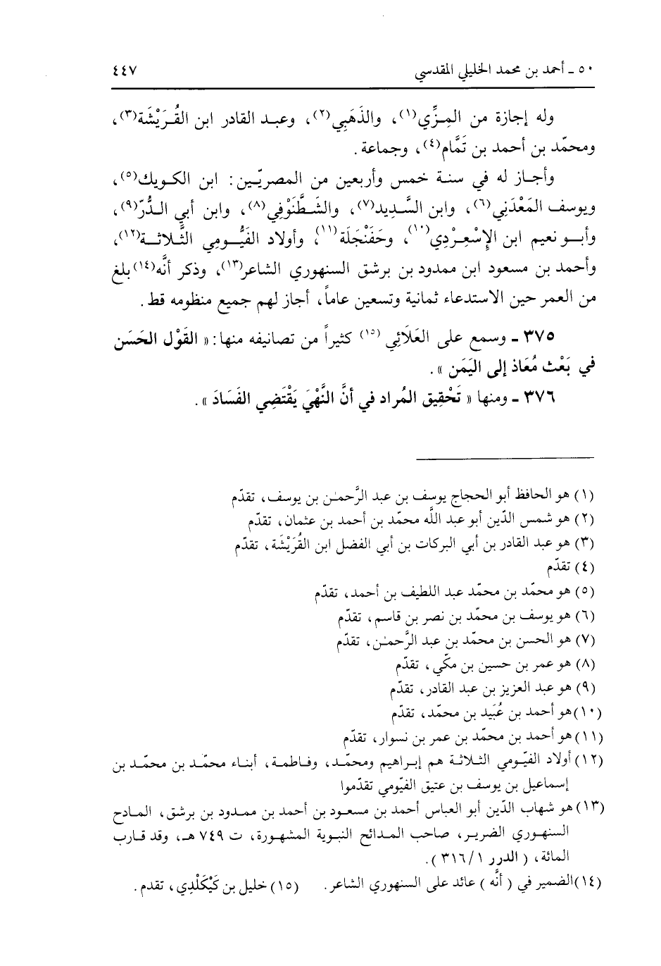 375 - وسمع على العلائي كثيراً من تصانيفه منها: "القول الحسن في بعث معاذ إلى اليمن".