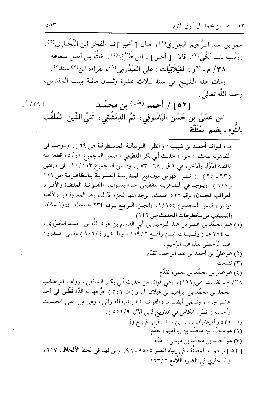 [52] أحمد (طب) بن محمد ابن عيسى بن حسن الياسوفي ثم الدمشقي تقي الدين الملقب بالثوم -بضم المثلثة.